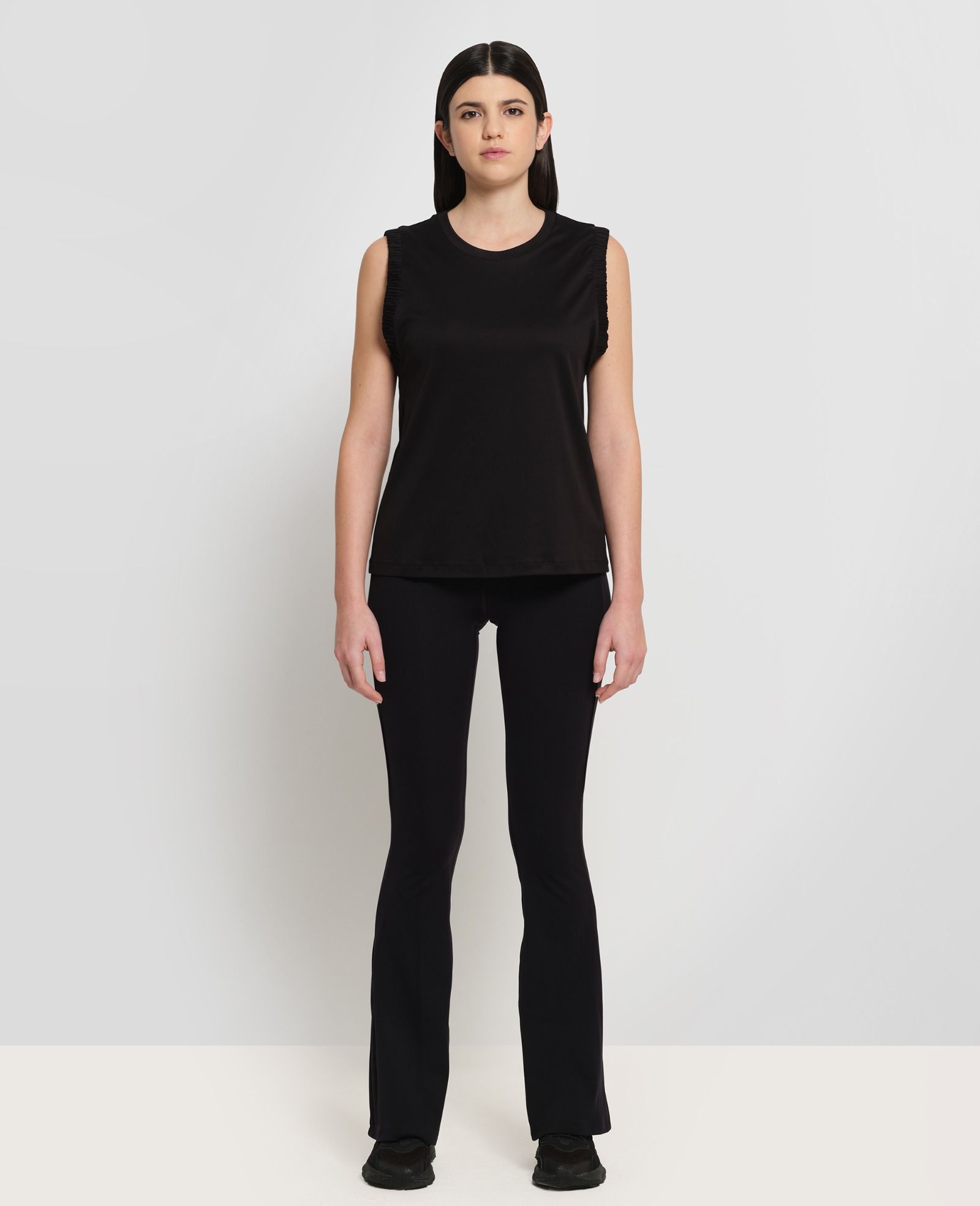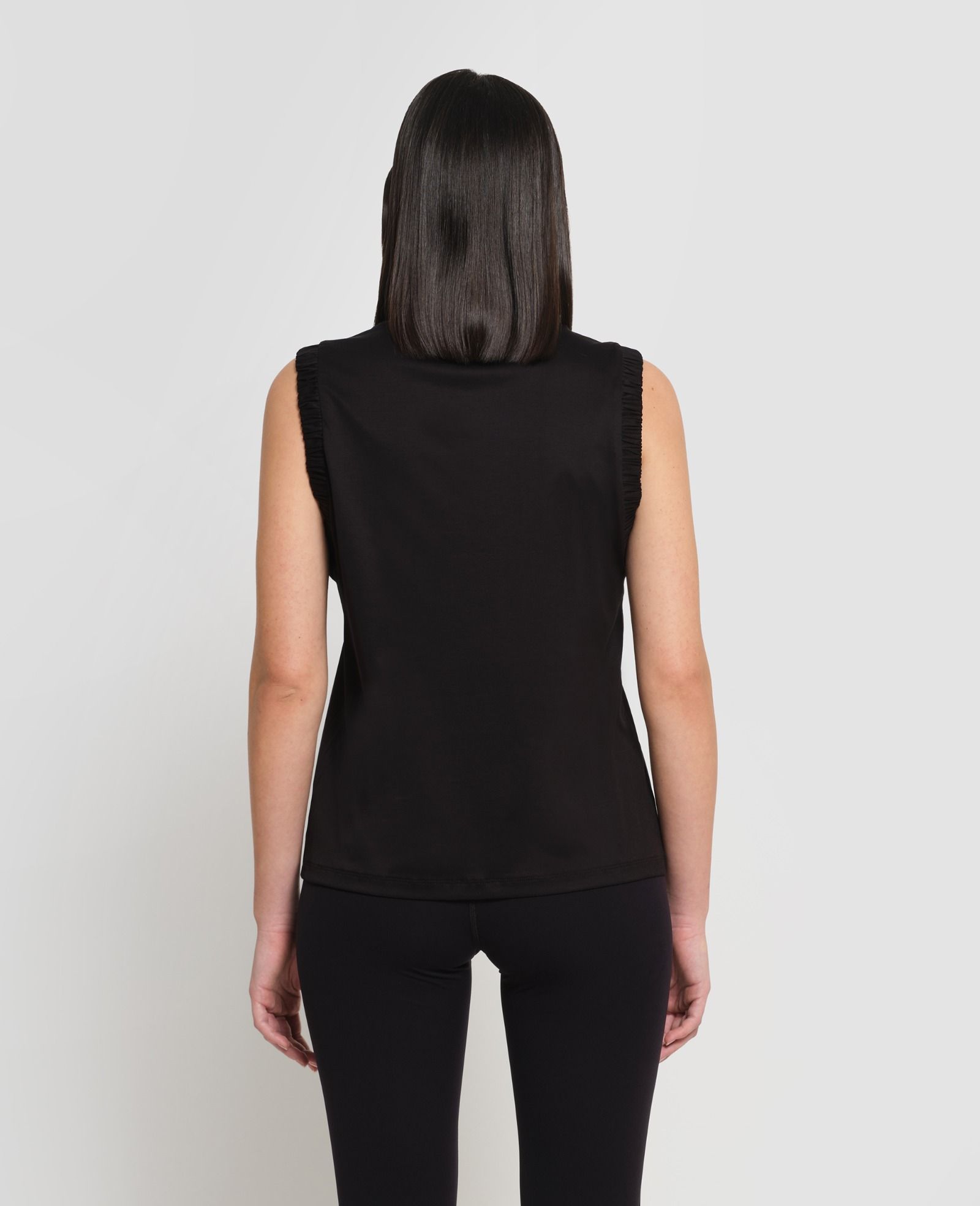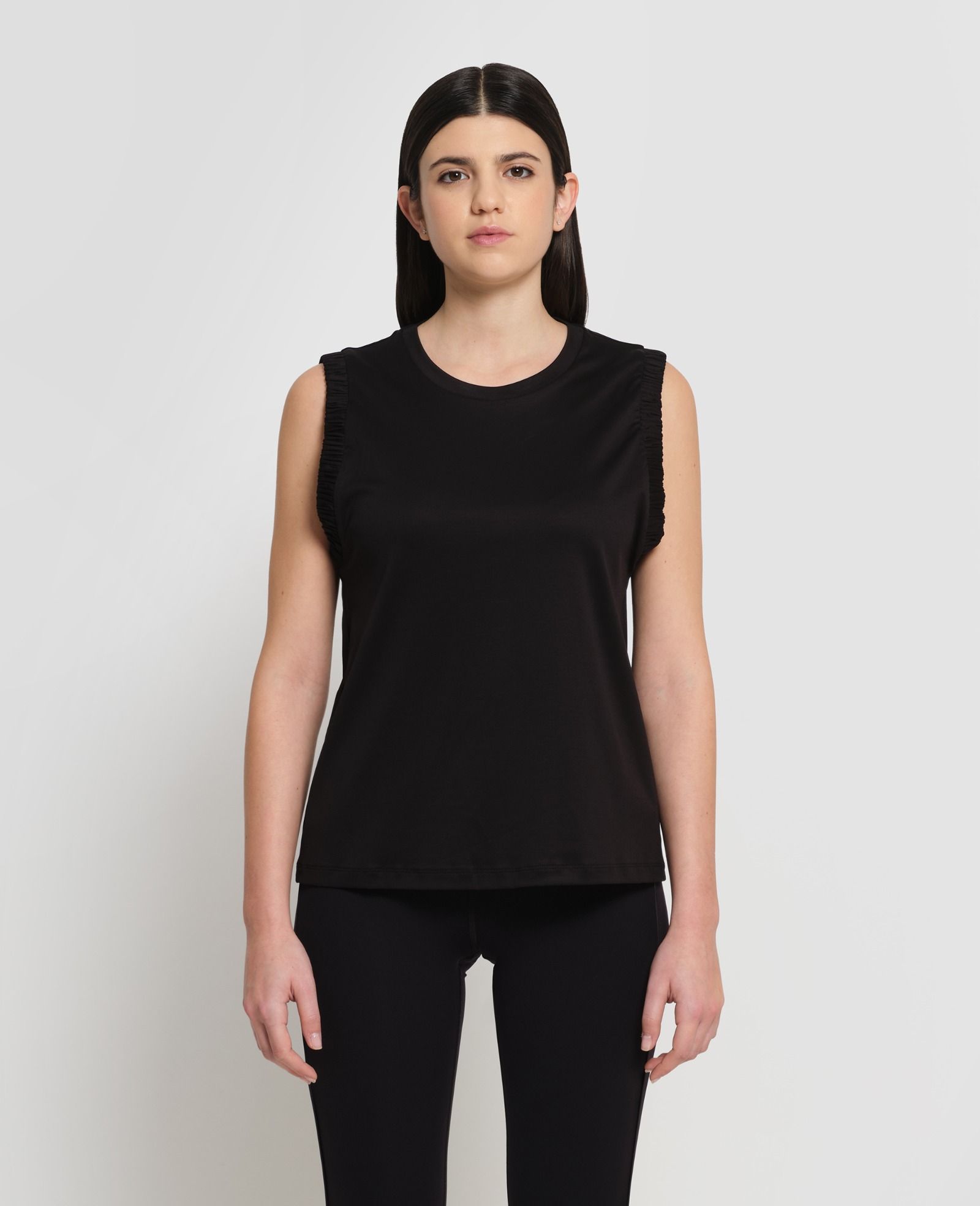 A refined essential that blends simplicity with contemporary character. This Tank Top is crafted from Interlock cotton, a compact yet soft fabric that provides structure, comfort and a smooth feel against the skin. The clean crew neckline is complemented by subtle gathered shoulder details with elastic, creating a soft and feminine volume. The hip-length cut and regular fit complete a balanced silhouette designed to move effortlessly through the most dynamic moments of your day.